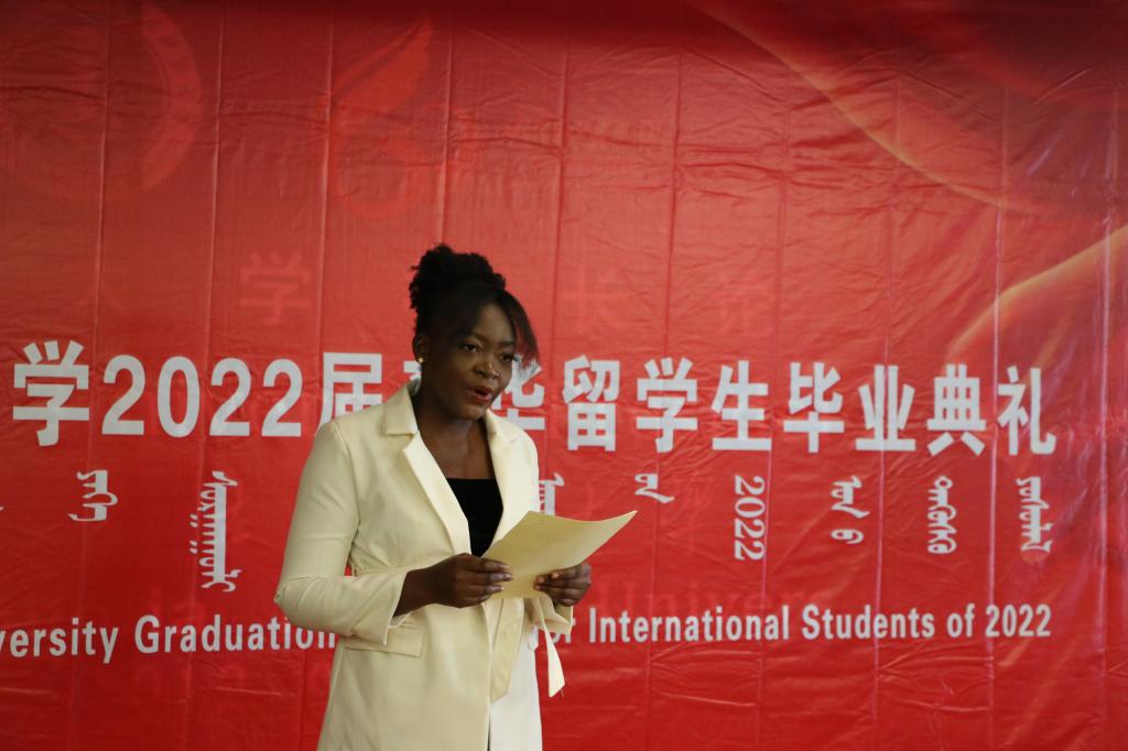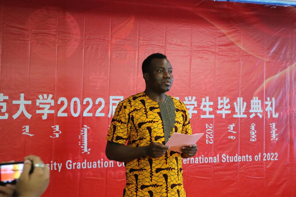 来自巴基斯坦的硕士研究生海达雅、来自蒙古国的本科生额尔登其其格、来自多哥的自费语言进修生本尼克和高飞作为毕业、结业生代表先后发言。同学们在发言中回顾了自己在今年会官网度过的美好时光,以及感受到的学校的温暖与力量,表达了对中国政府、对母校、对老师们的感谢与不舍。期待能成为中外友好使者,立志做一名讲好中国故事的国际传播者。