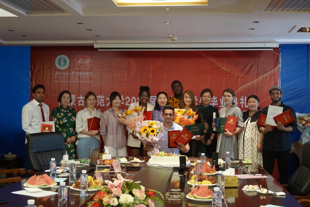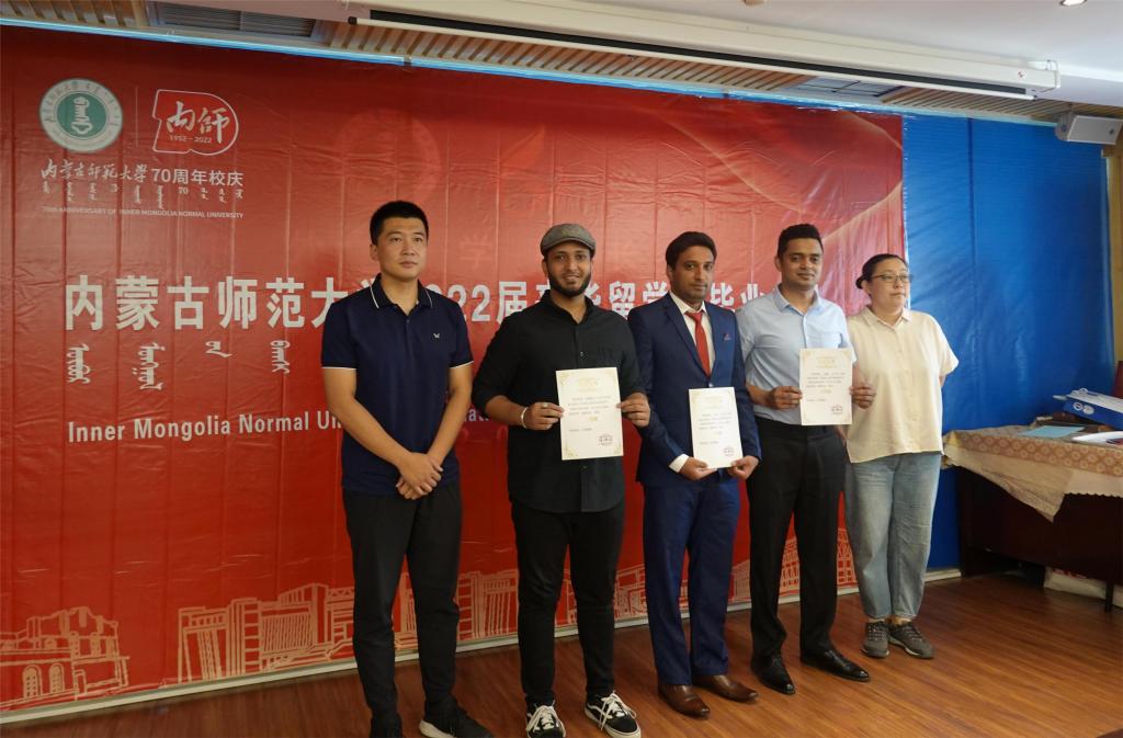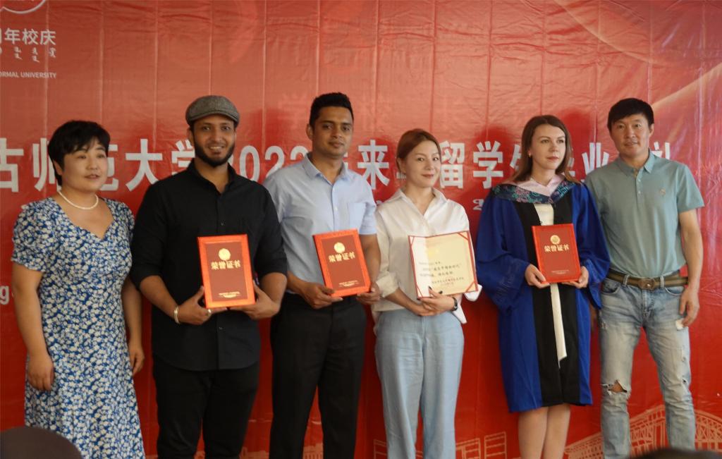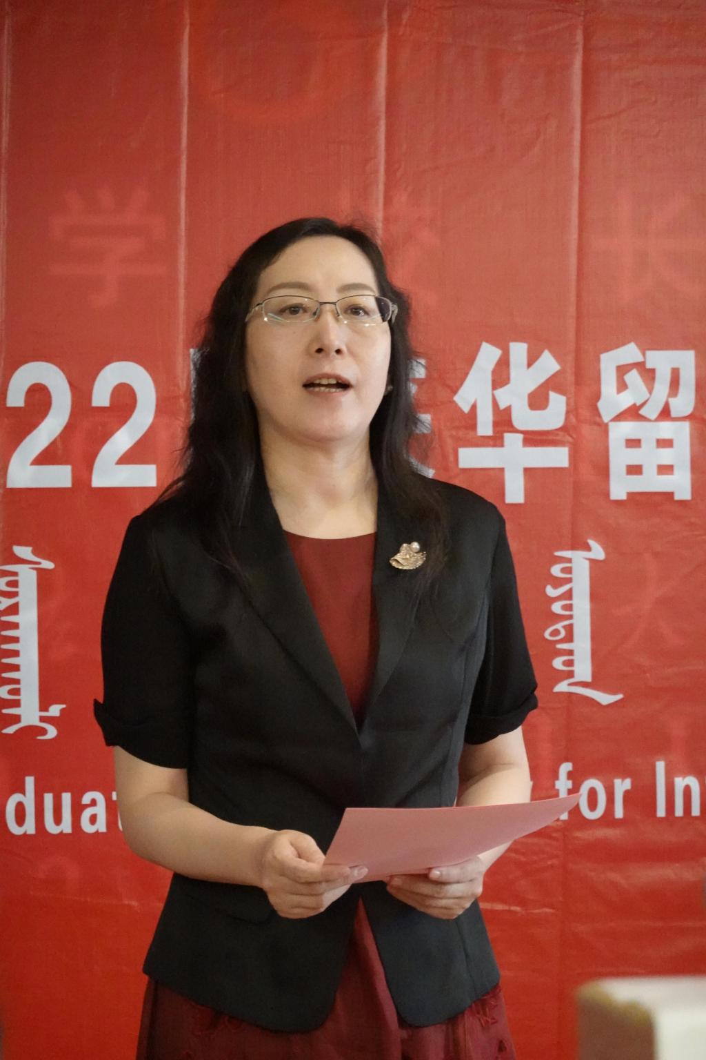 学院党总支副书记副院长白图力古尔宣读《关于参加教育部留学基金委主办的“感受中国新时代”征文、摄影、短视频优秀学生的表彰决定》和《关于参加内蒙古自治区第八届“我和中国的故事”国际学生汉语征文比赛优秀学生的表彰决定》,教师代表哈斯朝鲁、徐剑、索婷、敖楠老师为获奖留学生代表颁发荣誉证书。