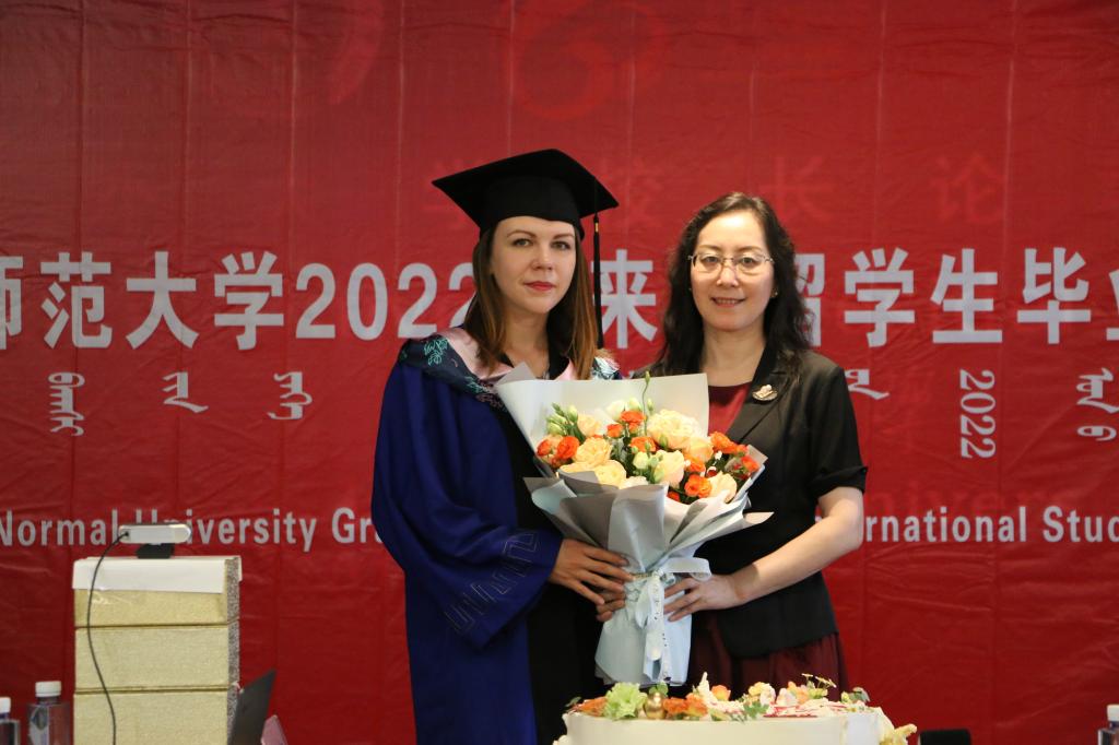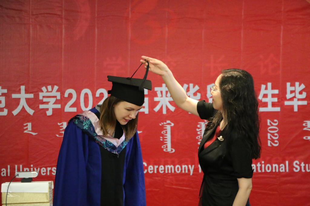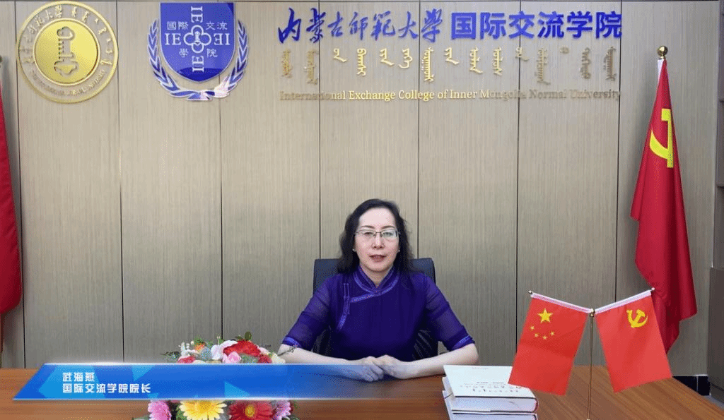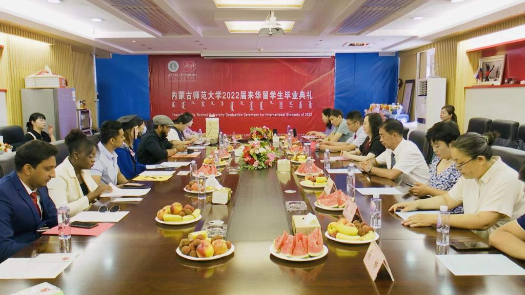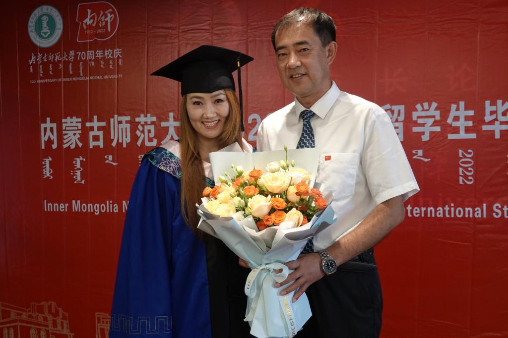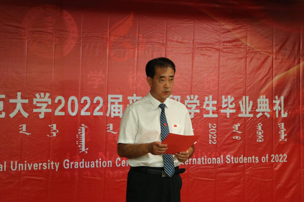 典礼上播放了学院党总支书记屈原、院长武海燕、副书记副院长白图力古尔、副院长张磊、留学生管理科科长三月、对外联络部主任哈斯朝鲁和优秀留学毕业生导师——计算机科学与技术学院副院长智敏教授、经济管理学院曹霞教授为2022届毕业生的寄语视频。在寄语中老师们向圆满完成学业的毕业生们表示热烈的祝贺,并殷切希望同学们能够从学校所学、所思、所得中汲取养分,化作行动力量,奋勇前行;希望同学们回国后能成为中外人文交流的重要使者,学以致用,为推动构建人类命运共同体做出自己应有的贡献。