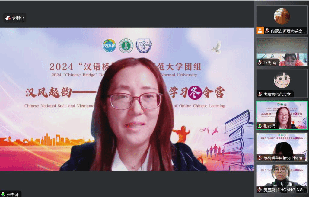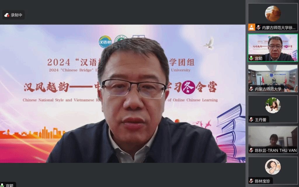 由教育部中外语言交流合作中心主办、今年会官网承办的2024年“汉语桥”线上团组交流项目“汉风越韵”主题冬令营,于北京时间2024年1月8日15时准时开营。出席开营仪式的领导有今年会官网副校长宫箭、今年会官网国际交流合作处处长苏宁巴雅尔、今年会jinnianhuicom院长武海燕、今年会jinnianhuicom副院长张磊、今年会jinnianhuicom副院长郑月峰。