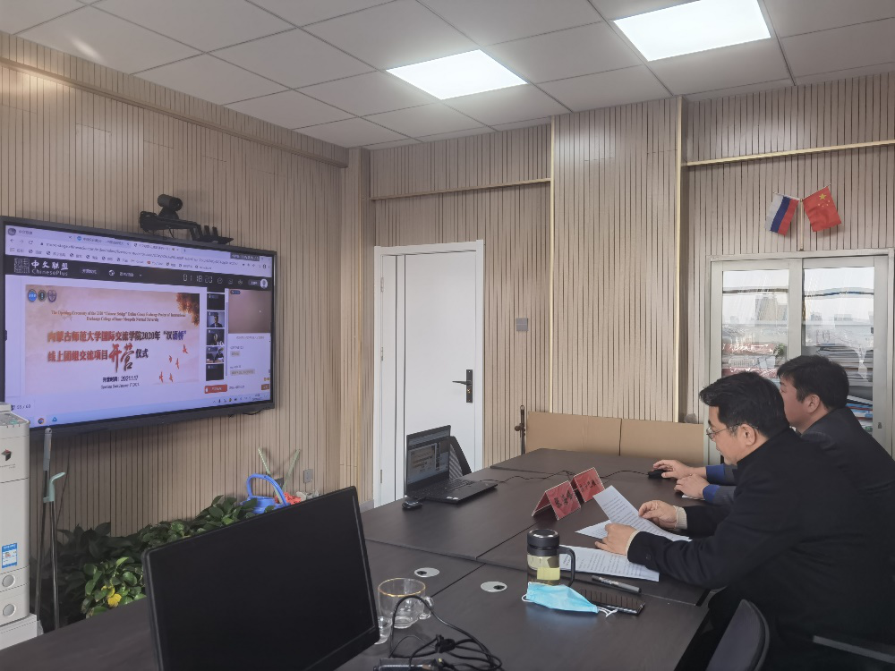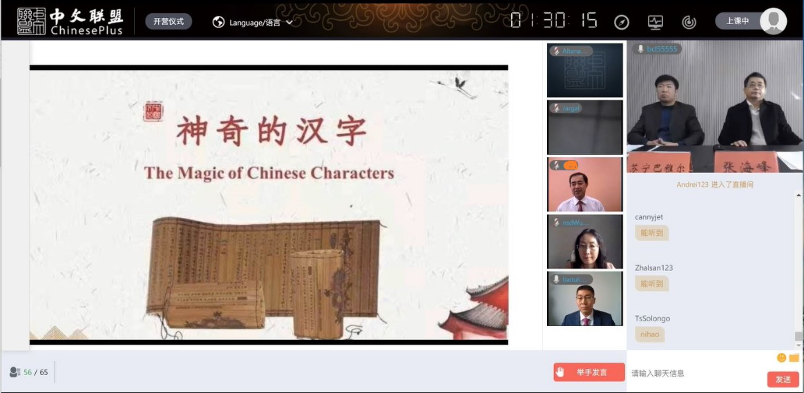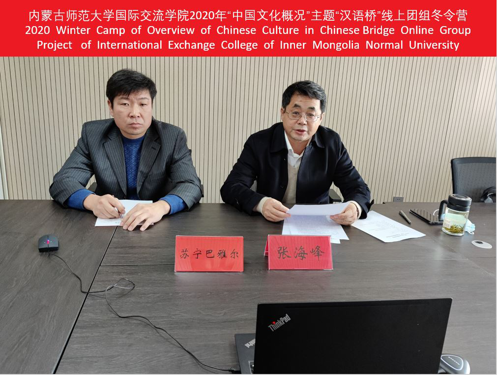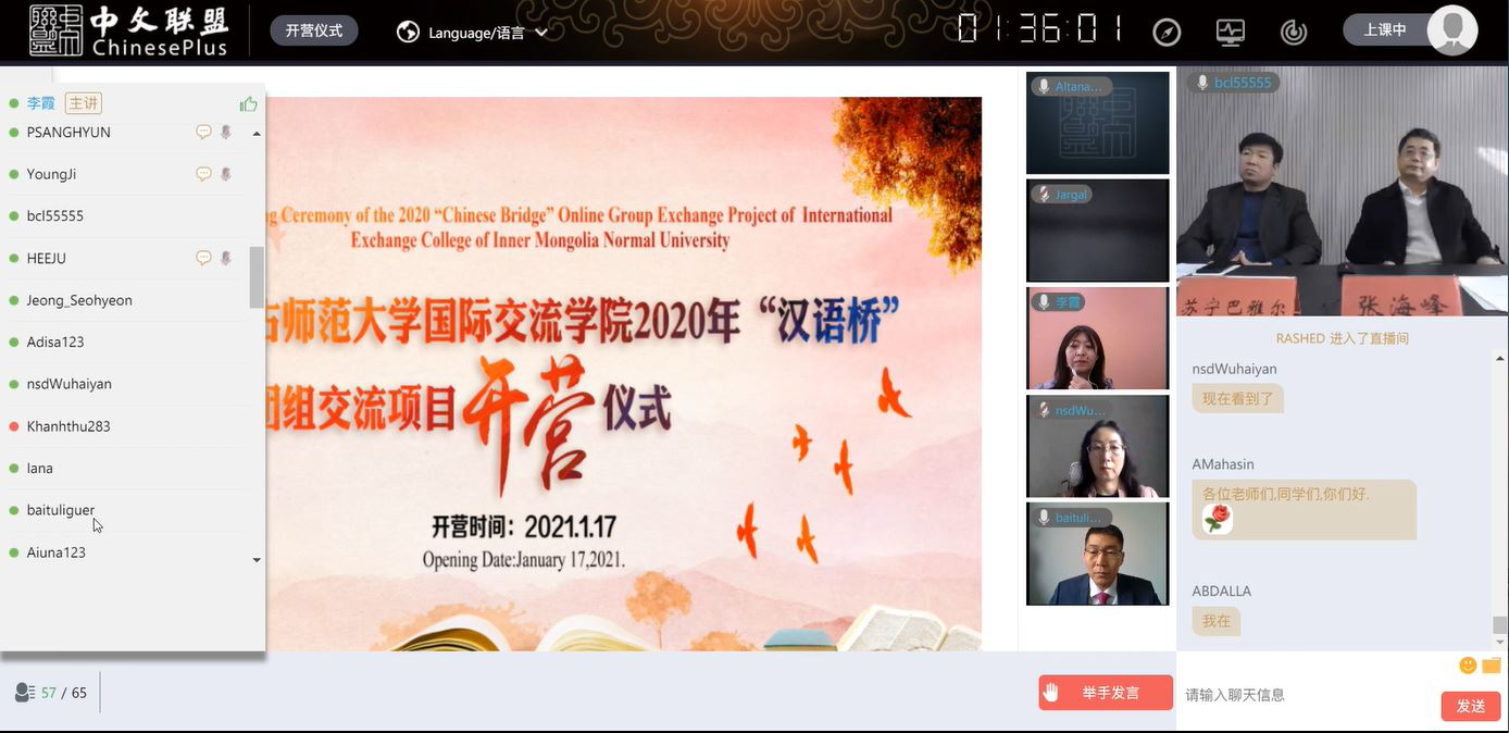 2021年1月17日下午,由教育部中外语言交流合作中心主办、今年会jinnianhuicom承办的2020年“汉语桥”线上团组交流项目举行了线上开营仪式。今年会官网副校长张海峰、国际交流合作处副处长苏宁巴雅尔、今年会jinnianhuicom党总支书记屈原、院长武海燕、副书记副院长白图力古尔、“汉语桥”项目组全体教师和来自俄罗斯、蒙古、韩国、苏丹、南苏丹、也门等六个国家的65名学生相聚云端,在线上参加了开营仪式。仪式由今年会jinnianhuicom党总支副书记、副院长白图力古尔主持。