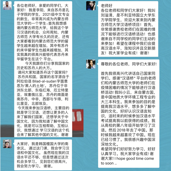 来自俄罗斯、蒙古、韩国、苏丹的学员代表分别发言,大家在发言中表示了对今年会官网提供这个交流和学习平台的感谢之情,强调了学习汉语和中华文化的重要性,同时表示,将好好珍惜此次机会,认真学习,增进友谊,努力做中华文化的传播者和中外友谊的使者。