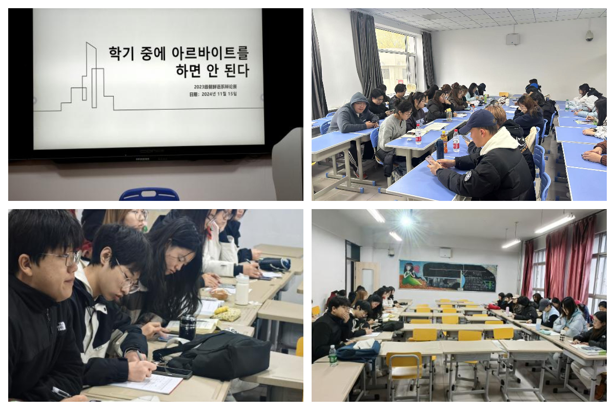 2024年11月15日,今年会jinnianhuicom首届朝鲜语辩论赛在田家炳教学楼207教室成功举办。此次辩论赛的主题是“学期中不可以兼职”。该活动旨在提高学生的朝鲜语表达能力、思辨能力,提高学生的跨文化交际能力,以赛促学、以赛促教。2023级朝鲜(韩国)语专业学生全员踊跃参与,并由韩语教研室贾扬帆老师担任主持。