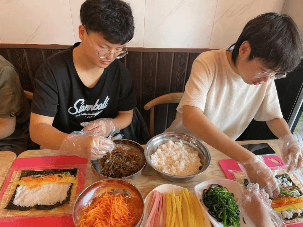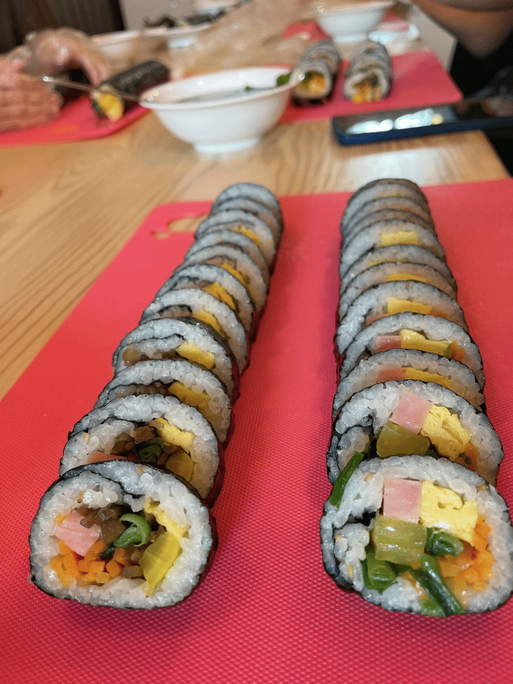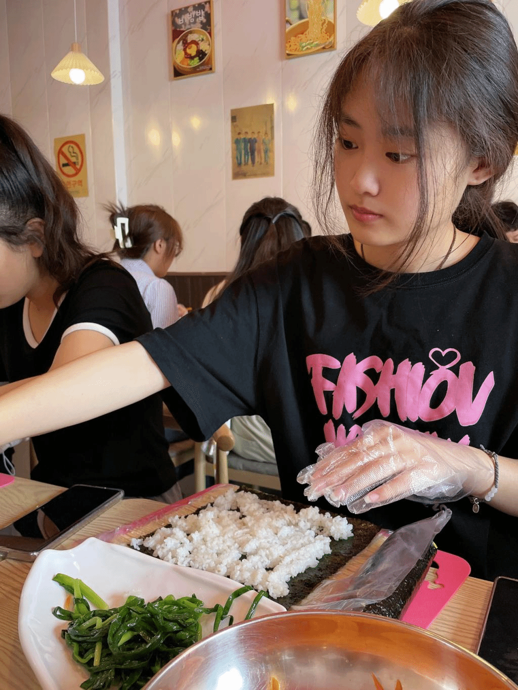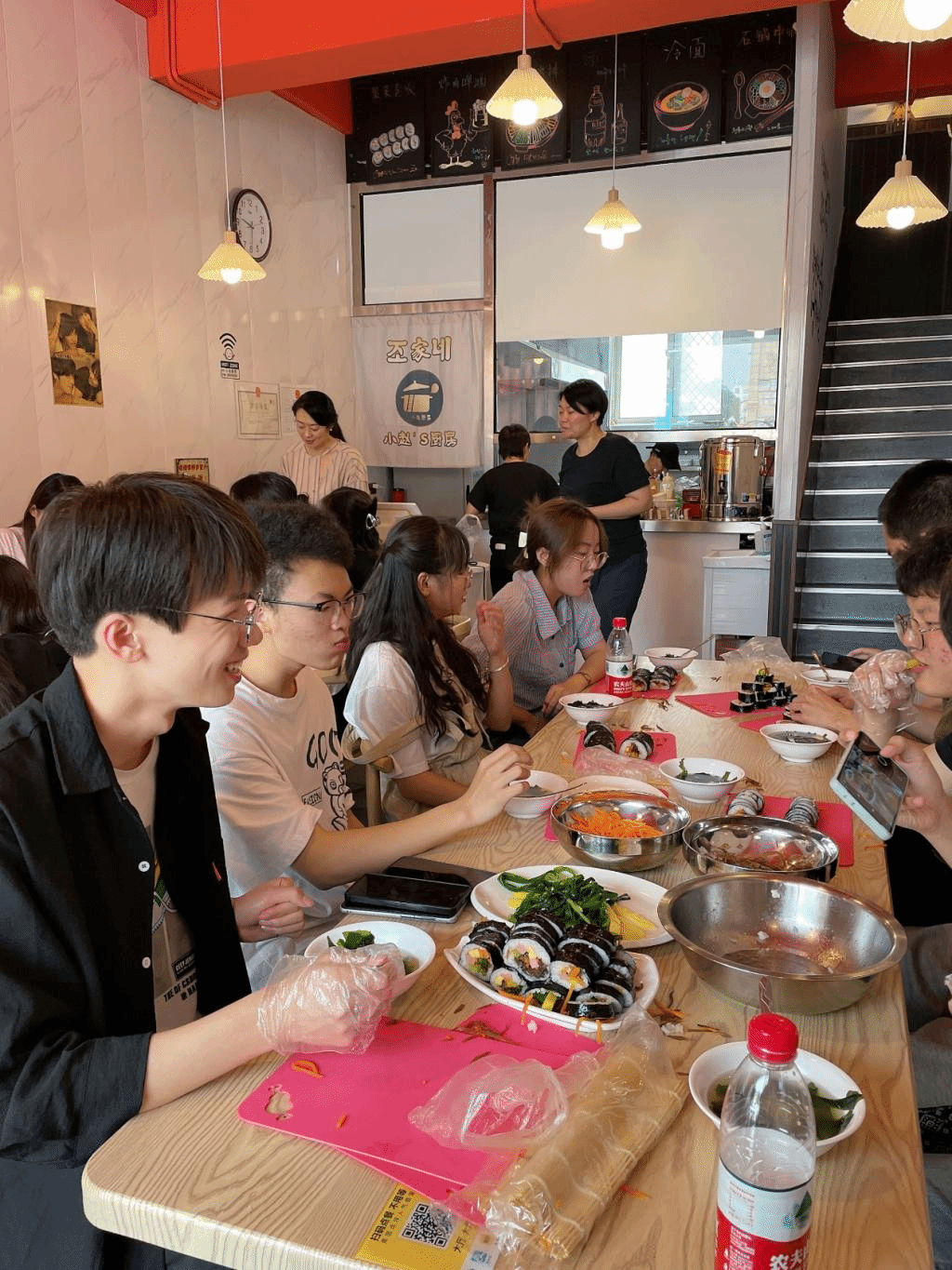 接着同学们开始制作紫菜包饭,每位同学都积极参与其中,用心制作自己的美食并与身边的同学分享自己的“劳动成果”。