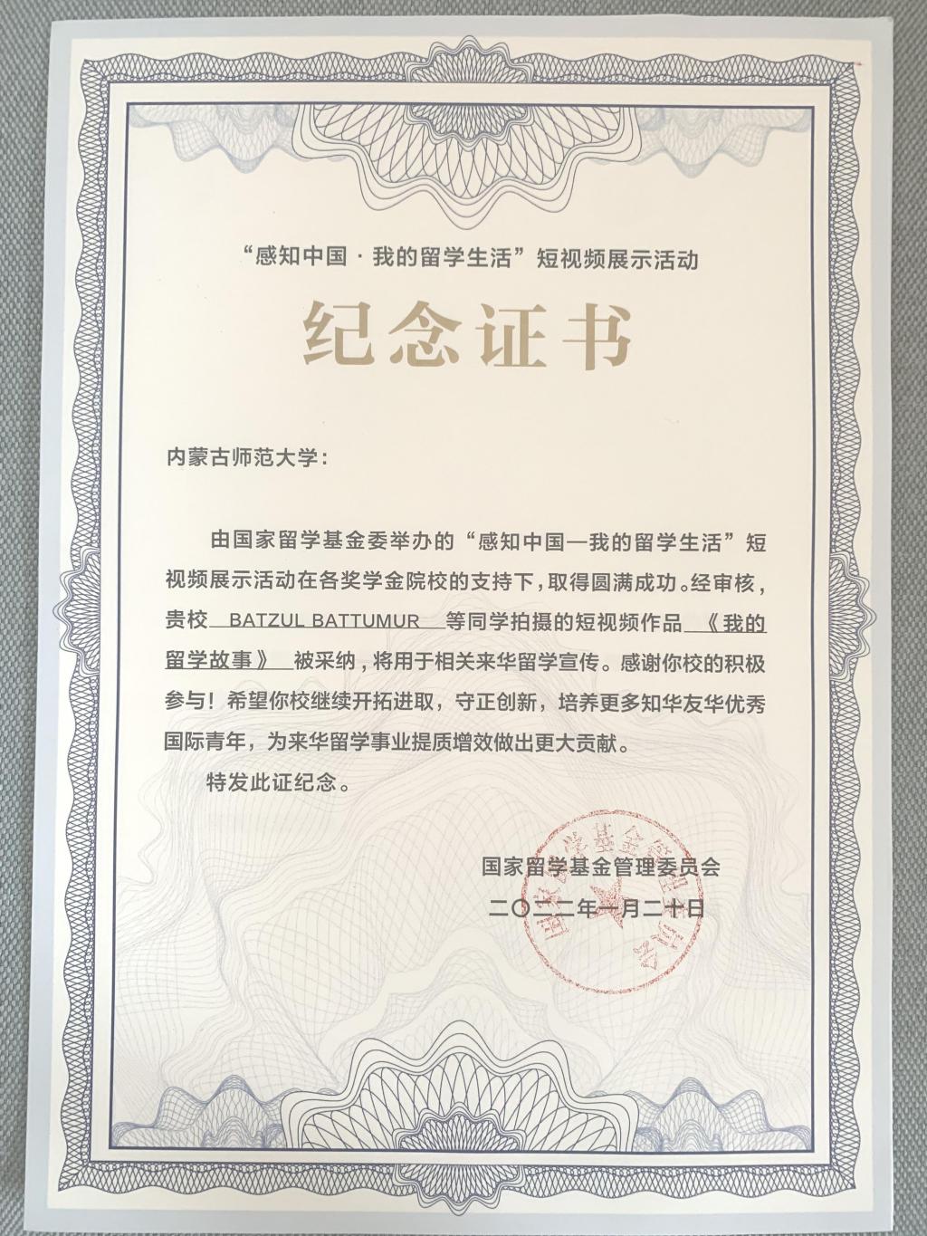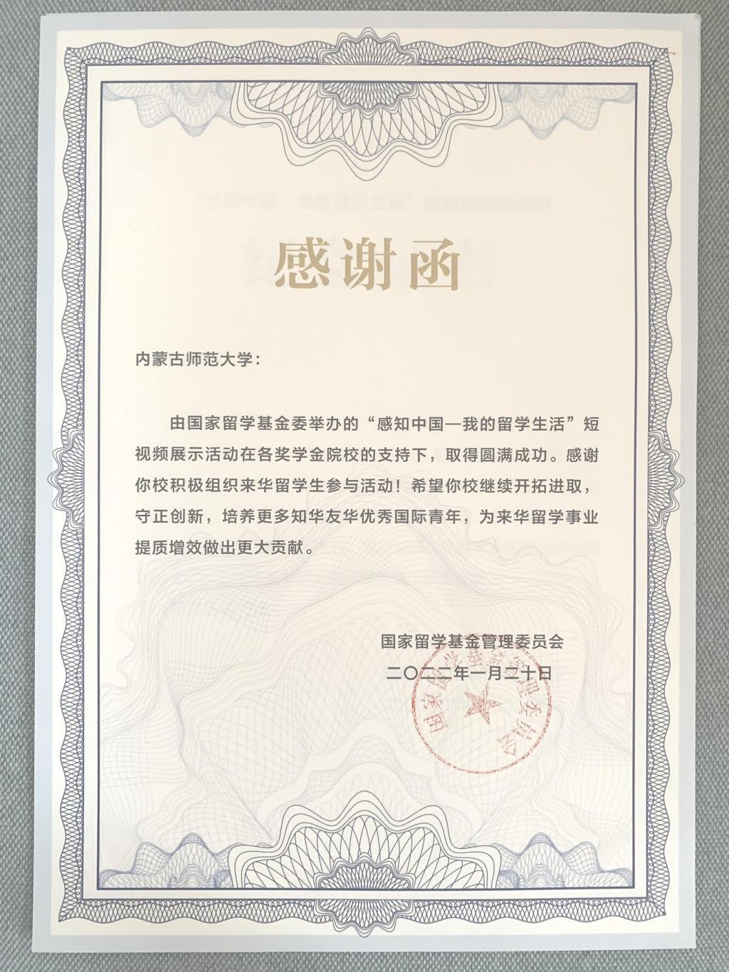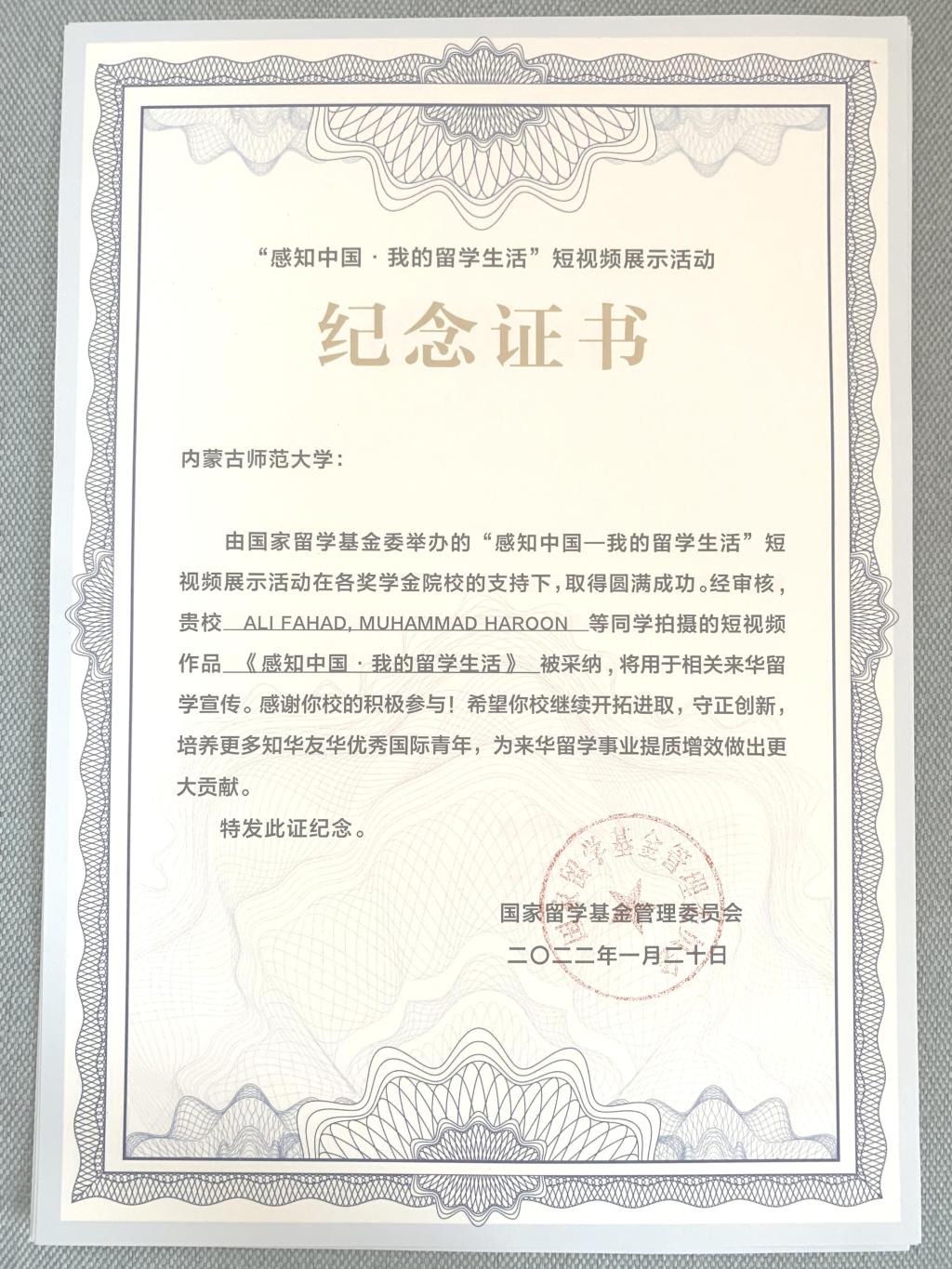 近日,国家留学基金管理委员会举办的“感知中国—我的留学生活”短视频展示活动结果公布。今年会官网今年会jinnianhuicom选送的巴基斯坦籍中国政府奖学金生浩然(ALI FAHAD)、浩宁(HAROON MUHAMMAD )的《感知中国—我的留学生活》和蒙古籍中国政府奖学金生巴图珠拉(BATTUMUR BATZUL)的《我的留学故事》等两部作品获得纪念证书,学校同时收到国家留学基金管理委员会感谢函。