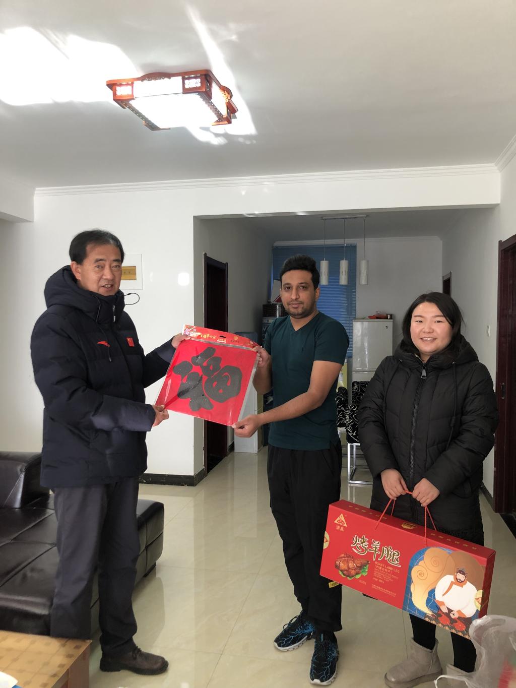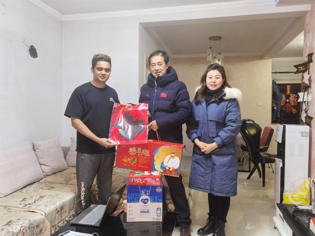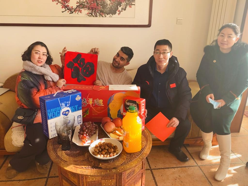 走访过程中,学院领导叮嘱留学生们在假期继续遵守疫情防控规定,加强安全防范意识,每日按时完成健康打卡,做好行程报备,尽量避免聚集性活动,遇到问题及时要向学院反映报告。此外,还为留学生们送上了新年礼物和祝福,希望每位留学生在中国过一个平安、祥和的春节。
