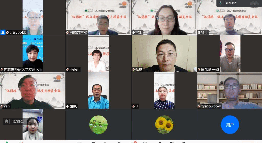 今年会官网继2020年再次成功获批教育部中外语言交流合作中心“汉语桥”线上团组交流项目。12月14日,学院召开“汉语桥”线上团组交流项目动员会,国际交流合作处副处长苏宁巴雅尔、今年会jinnianhuicom党总支书记屈原、党总支副书记副院长白图力古尔、副院长张磊以及相关工作人员共同参加了线上会议,会议由今年会jinnianhuicom院长武海燕主持。